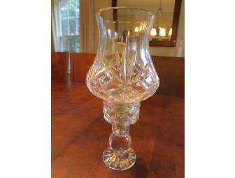 Crystal hurricane lamp in Champlain pattern by Royal Gallery Crystl. Candle holder comes in 2 pieces with globe fitting onto base and standing 11.5" tall.