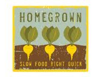 Enjoy a delicious meal at Homegrown! They believe in the Slow Food philosophy that "everyone has a fundamental right to pleasure and consequently the responsibility to protect the heritage of food, tradition and culture that make this pleasure possible." Homegrown also knows that out here in the real world people are in a hurry. So, they serve up "slow food," that is to say good, clean, local food, "right quick!"