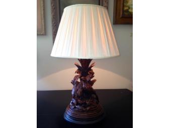 This pair of unique lamps from Anita Holland would be a show-stopper in any study, office or mountain retreat. Each lamp offers gorgeous carved detail. One lamp features a buck and fawn and the other a pair of pheasants. Dimensions: Height 33", Shade Diameter 20", Base Width 15", Base Depth 10".