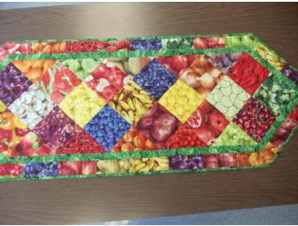 CCA's own Suzanne Adler handcrafted this very colorful tablerunner measures 54" x 19 1/2" and is aptly named "Eat Your Fruits and Veggies". It is very colorful and will add a wonderful touch to any table.