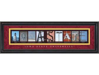 Iow a State University Campus Letter Art features high-quality, individual photos of buildings or sculptures taken on campus. A caption is included below each photo showing where it was taken. Expertly framed with a crystal clear glass front, this unique product arrives ready to hang in any room of the house or office.
