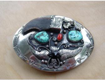 The Turquoise and Coral artfully contrast one another with their natural cool and hot colors. Native American jewelry artists often use Turquoise and Coral in their work to honor the Father Sky and Mother Earth. Hand-twisted Sterling Silver wire spirals, Sterling Silver feathers and flower figures with hand-made Sterling Silver dots offer this belt buckle extra detail. This Belt Buckle is 2-3/4" wide and 3-3/4" long with a 1-3/4" wide keeper on the back. Stamped by the artist (unknown) on the back.
