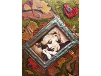 This beautiful piece is a Mixed Media Photo Montage measuring 11" x 14". It is made with recycled, re-used, and re-purposed materials—wood, paper, plastic mesh, mosiac pieces, arcylic and glitter paint. This one-of-a-kind artwork will look great in any home or office.