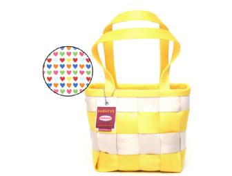 Who doesn’t love sipping a Pina Colada on a hot summer day? Meet Pina Colada, one of 6 Summer Luvin’ Mixers. A woven combination of Buttercup yellow and off-white Pearl seatbelts. It includes a cute multi-colored heart design on white cotton fabric lining and multi-colored hangtag. Available in our small tote silhouette, with 2 handles long enough to wear over your shoulder and polished nickel hardware.