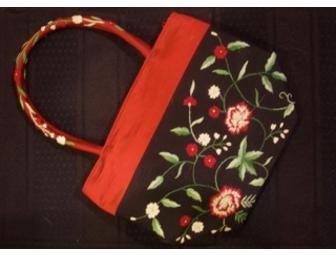 Delightful accessory for spring, purse and handles embroidered with flowers and lined in crimson silk. Zippered compartment inside plus a practical pocket for your cellphone. Crimson zip to close the bag as well. 9.5" wide and 7" deep