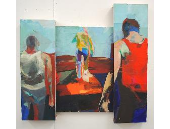 Three Men Walking Away, 2012, triptych, acrylic and collage on panel, 2 x 4 feet, 4 x 4 feet, 2 x 5 feet