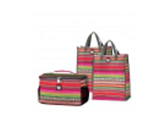 The bag you'll never forget! Chill Set 3 bags in 1- Love Blanket- Stripes red, pink. green, yellow, black, gray... The 3-bags-in 1 set includes an insulated thermal cooler with two sturdy, reusable and washable shopping bags that hold up to 60 lbs. The cooler is designed with side mesh pockets for storage and an adjustable shoulder strap for comfort. The shopping totes inside Stand Up on their own for easy loading and unloading. Fashion and function .... 8" h x 13"w x 8" d