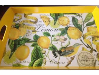 Beautiful Wooden Tray with lemons/birds/branches design on the interior side... perfect gift or even a hostess gift. Size: 20" X 13 3/4" x 2 3/4".