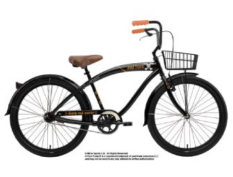 Bike Ride in style with this super cool Paul Frank Skurvy Road Warrior by Nirve. 1 speed gearing, Nirve gallaxie Alloy Frame, Kandy-bar ergonomic handlebar, vintage grips, comfort saddle, full covered fender set, Alloy Wheels, classic tread 26" tires, kickstand, equipped with front hand brake and rear coaster brake. Accessories included: "I love my Bike" bike bell and wire basket.
