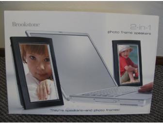 New Brookstone 2-in-1 photo frame Speakers. Replace those ordinary speakers with great sound and favorite photos. Each frame holds one 4x6 photo. Photos in the front, USB Speakers in the back.