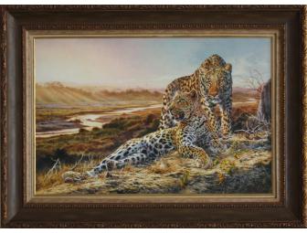 Capturing the strength and grace of these gorgeous leopards amidst the South African landscape, renowned wildlife artist David Langmead of Zimbabwe shows his brilliant use of light in this beautifully framed limited-edition giclée print on canvas. “Riverside Rapture” (#4/99) measures more than four feet wide, making this enviable artwork the perfect choice for an incredibly striking focal point in any living space.