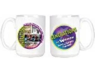 "Generations of Women Moving History Forward" mug. This white 15oz. mug with colorful logos on both sides provides a great daily reminder of the, "Generations of Women Moving History Forward".