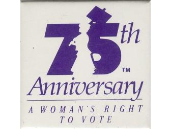 In 1995, the National Women's History Project led the national campaging to encourage the nation to celebrate the 75th Anniversary of the American Suffrage Movement. 1920-1975. This anniversary button was among the materials we developed to call attention to the important historical 75th anniversary of women in the United States winning the right to vote. |