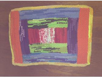 Leanne Anderson and her daughter Nina are artists in knitting. This is a collaboration - Nina's design, Leanne's knitting - creating brilliant color with repurposed cotton t-shirts. 34" by 24", machine washable.