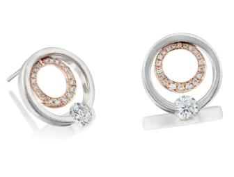 14 kt rose and 14k white gold earrings includes a 5mm moissanite in each (equivalent to a 0.50ct diamond each).