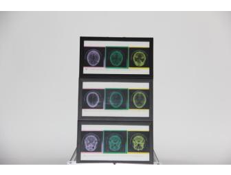 This triptych includes interpretive images of three different CT scans of the human brain.
