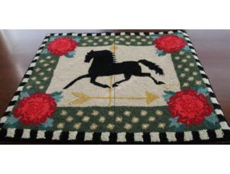 This is a beautiful area rug by Claire Murray that measures 24" by 30". It is 100% wool with a lovely design of a stallion weathervane.