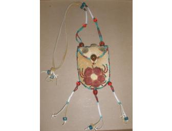 The pouch is a medicine bag with tanned moose hide and glass and dentalium shells. The flower arrangements are moose fur tufting. It is of Athabaskan style. Athabaskan is on of Canada's First Nations People.
