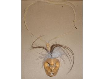 The miniature mask is Northwest Coast and First Nations item. Traditionally the material is either red or yellow cedar. This one is yellow cedar with feathers added.