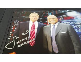 Direct from ESPN a signed photo of John Gruden along with Mike Tirico to add to your Monday Night Football collection. Also included an ESPN Monday Night Football hat and an ESPN Coolege Basketball hat. These hats are limited editions and are not sold in stores.