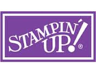 A scrapbooker's dream! A Stampin' Up scrapbooking basket filled with paper, rubber stamp, stamp pads, note cards, envelopes and ribbons, and other materials.