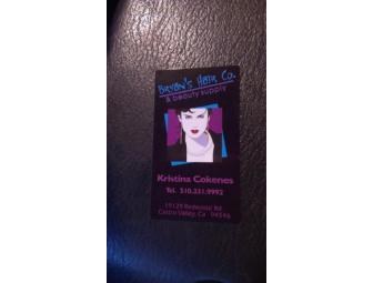 A gift certificate valued at $150 for salon services by Kristina Cokenes at Bryan's Hair Company in Castro Valley. Good for any of her services: cut, color, highlights, facial waxing, styling. For women, men, and children.