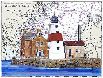 "Chart art" artwork utilizing a nautical chart of part of Long Island Sound, with image of the historic Execution Rocks Lighthouse. Overall size 16x20", actual image size 10.5"x14". Unframed.