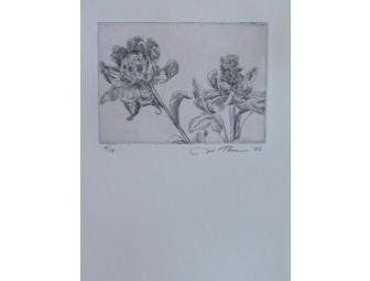 Elegant artist’s proof of an etching by Austin artist Jill Thurber, 2005. Black and white etching depicting flowers, expertly mounted in a shadowbox and framed in silver, gold, cream, and peach tones. Frame is wood with glass. Finished size 19.5” wide x 22.5” high.