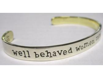 On the outside of this delicate slim cuff bracelet is inscribed Well Behaved Women Rarely Make History.
