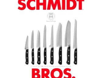 This 15-piece set of knives and block is fully forged from 100% German high-carbon stainless steel and rock blasted to create a fully non-stick surface. This modern design has the patented Schmidt Brothers Curve, so your forefinger can guide the blade with greater precision and control. This series also features a stone ground edge and full tang handle.