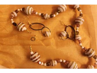 The necklace and earring set is provided by the Community Craft Collective, a collective made up of artisans, members from Luther Place Memorial Church, and Georgetown University students. The group formed when several women realized they could produce quality art that people love. The collective serves as a place where women can teach and support each other while developing creative skills that become a source of income for its members.