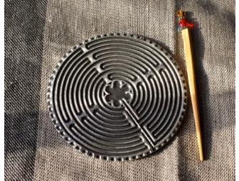 A beautiful labyrinth for your desk. 4 1/2" in diameter, sturdy pewter-colored metal.