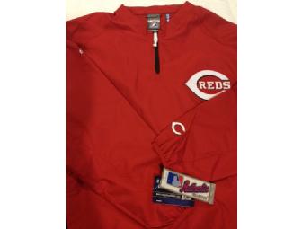 We all love the Reds here in Cincinnati and now you can show your support in this 2XL quarter-zip jacket! You'll fabulous when you go down to the "Great American Ballpark" and enjoy the game! This jacket features the team logo on the left chest and a smaller logo sewn on the left sleeve.