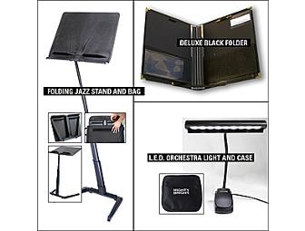 The winning bidder will receive a new "loaded" deluxe Black Folder, a sturdy folding "Jazz Stand" and its shoulder bag with room for the stand and folder, and a 9 LED Orchestra Light which illuminates up to 4 pages, packs flat in its zipper pouch, and runs on batteries or A/C. Everything you need anywhere, in one bag! No more scratching the back of your car with metal stand legs as you rush off to rehearsal and performances...