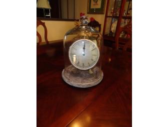 This elegant clock within a glass dome adds a sophisticated look in any home.