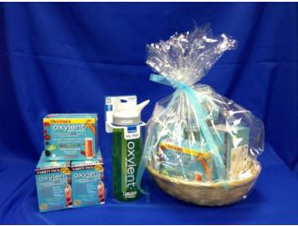 Oxylent Gift Basket filled with their high-quality, multiple-award-winning, daily multivitamin drink mixes together with a Camelbak water bottle for on-the-go refreshment. The basket contains: 2 boxes of Oxylent in Variety Pack (containing all 3 of their sparkling, 0 calorie flavors: Berries, Mandarin, & Blackberry Pomegranate), 1 box of Children’s Oxylent, and 1 Camelbak water bottle.