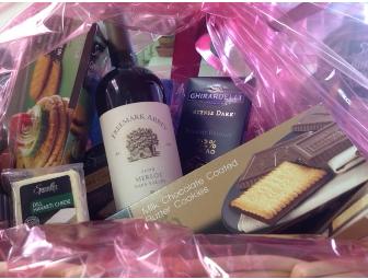 Who can have wine without cheese? Win this gorgeous basket and you'll also enjoy smoked gouda,dill havarti, aged white cheddar, and brie cheese! Did someone say chocolate? You'll also take home milk chocolate coated butter cookies and Ghirardelli dark chocolate!