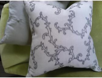 Jane Schwab of Circa Interiors offers a pair of neutral linen blend pillows with button back and crewel work vineyard front.