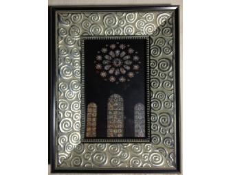 Colorful stained glass image of a rose window at Chartres Cathedral, France. Framed in a silver metallic frame featuring spirals. Piece can be free standing or hung on a wall. Overall size of framed item is 7" wide by 9" tall.