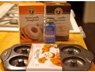 Here's a wonderful kit from King Arthur Flour: a pan that bakes six donuts, buttermilk donut mix, vanilla buttercream frosting mix, and blue sugar to decorate the donuts!
