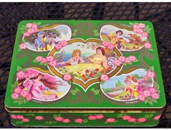 What could be more disarming than to fill this tin with your home-baked cookies and present it to a friend? Discovered in an antique shop and embellished with scenes of the four seasons, the tin is 9" by 7."