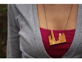 This pendant features the Austin skyline with exquisite detail down to the star on the Texas State Capitol building. There is also a tiny Texas charm on the clasp end. Birch wood on brass chain measures about 18" in length.
