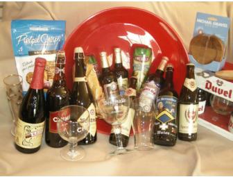 From Belgium: a 750 ml bottle of each of these: Chimay Ale (blue lable), Lindeman's Kreik, St. Feuillien Triple, Corsedonk, Delerium Tremens, Tripel Karmeliet, plus: 330 ml bottle of Maredsous Brune, a gift pack of four 330 ml bottles of Duvel Ale.