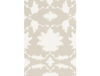 Mary McDonald's love of classic textiles is evident in this bold print, which is derived from a traditional antique Persian rug. The stylized motifs of flowers and leaves in the classic carpet design are interpreted anew as silhouetted shapes against a backdrop of color, creating a graphic, modern pattern on a textured linen ground. The dramatic scale works perfectly for chair upholstery, pillows and draperies. Dimensions: 22” by 22”.