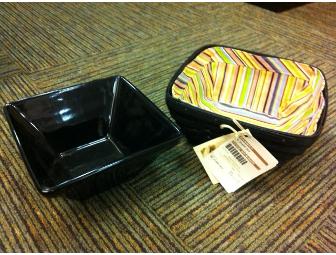Longaberger Coordinated Basket & Pottery: black medium-flare with summertime striped liner and black contour medium-flare bowel.