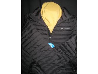 Built to make goose bumps, shivers, and blue lips a thing of the past, the Columbia Men's Powerfly Puff Down Jacket surrounds in a virtual fortress of lightweight, compressible 800-fill down insulation. Omni-Heat liner tech ensures that every last BTU of body warmth is salvaged, and the lightweight, durable shell packs down small without backing down from big challenges. In black, Men's size L. Omni-Heat thermal reflective liner material reflects infrared energy back towards your body for increased warmth retention. Omni-Shield water-resistant coating protects the down insulation from light rain and passing snow showers. Premium 800-fill down insulation packs down small, rebounds after repeated compressions, and features a higher warmth-to-weight ratio than synthetic fibers. Drawcord hem and comfort cuffs help prevent drafts.