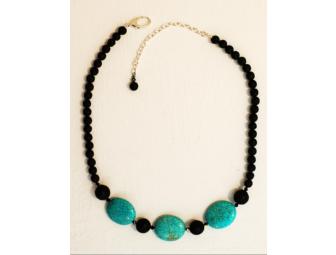 Turquoise is complemented with lava beads and Swarovski crystals in this lovely piece by member artist Beth Hylen.