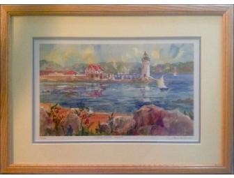 This framed print depicts Portsmouth Harbor Lighthouse in New Castle, New Hampshire. Framed size 22 3/4" x 17".
