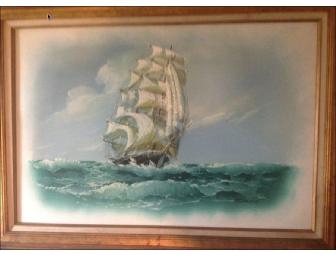 This magnificent original acrylic painting of a tall ship on the high seas is approximately 30"x40" framed. Signed by the artist "Robertson."
