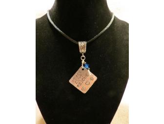 A custom hand stamped Peace, Love, Rescue necklace. The pendant is stamped on a 1" square 1/8" thick piece of aluminum with textured edges and a medium blue 6mm swaroski bi-cone crystal. The necklace is black satin cord approximately 18" long.